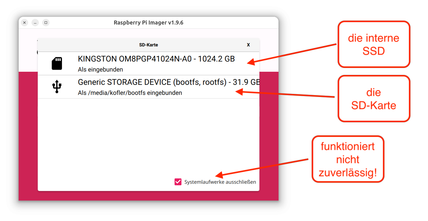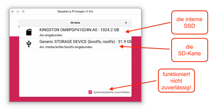Bei der Auswahl der SD-Karte im Raspberry Pi Imager ist Vorsicht angebracht. Bei meinen Test zeigt das Programm eine interne SSD mit dem SD-Karten-Symbol in der Auswahlliste an. Richtig ist natürlich der zweite Eintrag. (Die Größe ist der beste Indikator, welches Listenelement richtig ist.)